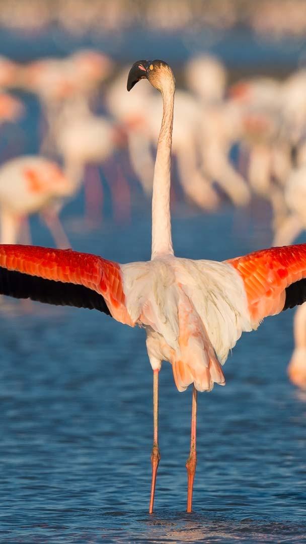 At the gateway to Saintes-Maries-de-la-Mer, the Camargue Regional Natural Park unfolds its landscapes of water, salt and light. Here, amidst marshes, salt marshes and lagoons, the greater flamingo reigns supreme. In the shallow waters, these graceful birds, with their pink feathers and wings tinged with red and black, perform an unforgettable aerial ballet.