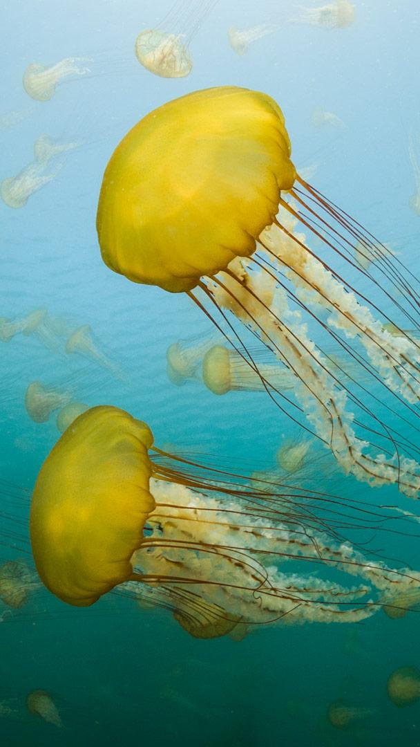 Jellyfish may be observed in all the world"s oceans in an array of shapes and sizes. There are about 2,000 different species of jellyfish, and they all lack hearts, bones and brains. Pacific sea nettle jellyfish, seen here, are known for their vibrant golden-brown bell, long tentacles and inhabit the coastal waters of California and Oregon. Moon jellyfish are pale and have short tentacles, and in an unexpected but somewhat appropriate twist, they ventured into space aboard the space shuttle Columbia in 1991 to help scientists study their unique biology. No matter the species, jellyfish play a vital role in the ocean"s food chain, as they are the primary food source for many seawater animals, including sea turtles. Jellies are threatened by climate changes, marine pollution and overfishing, and damage to their populations has reverberating effects on the sea life that depends on them.