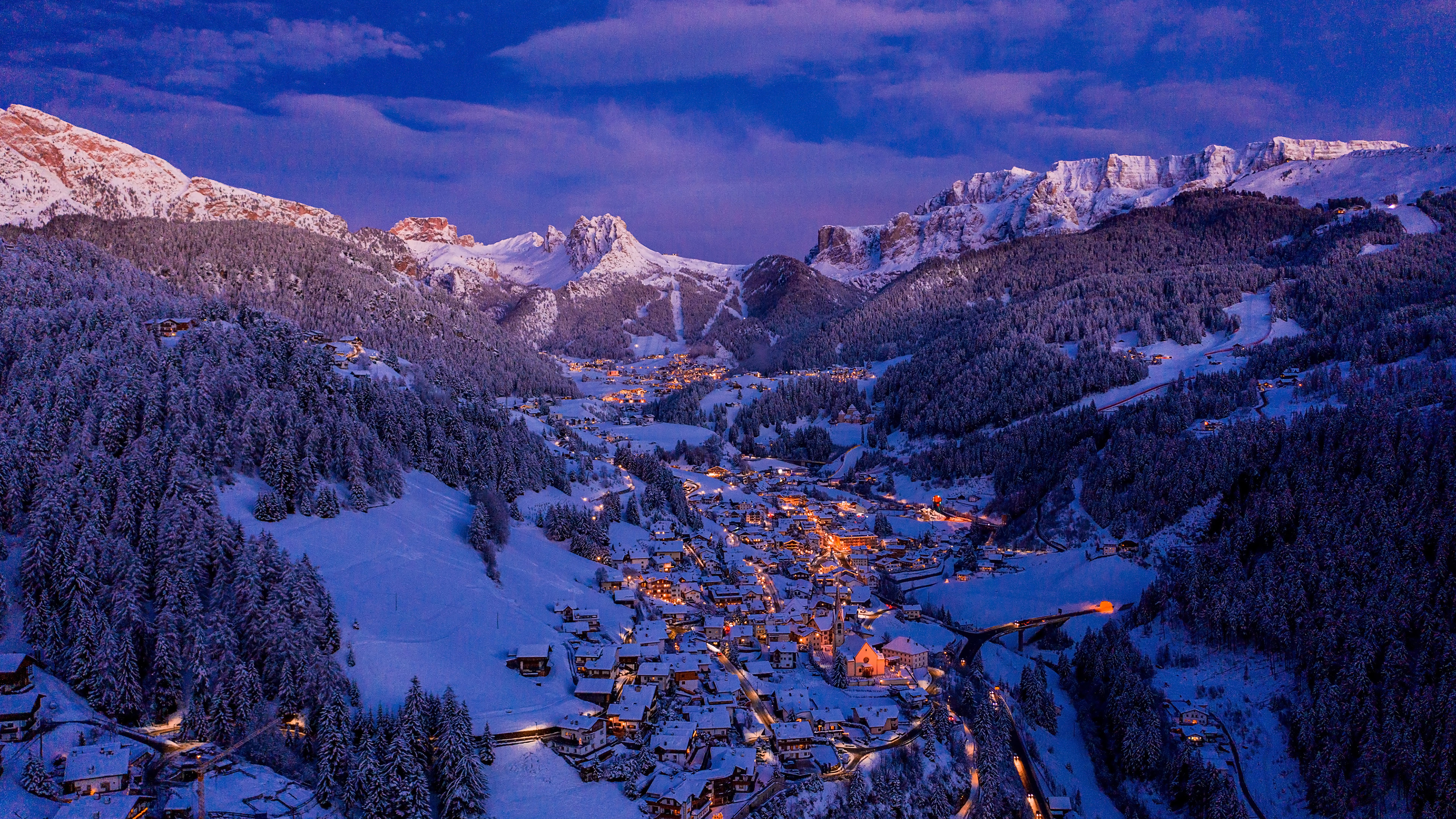 Luzes das Dolomitas Aldeia em Val Gardena no Natal, Dolomitas, Itália (© Ingus Kruklitis/Getty Images)
