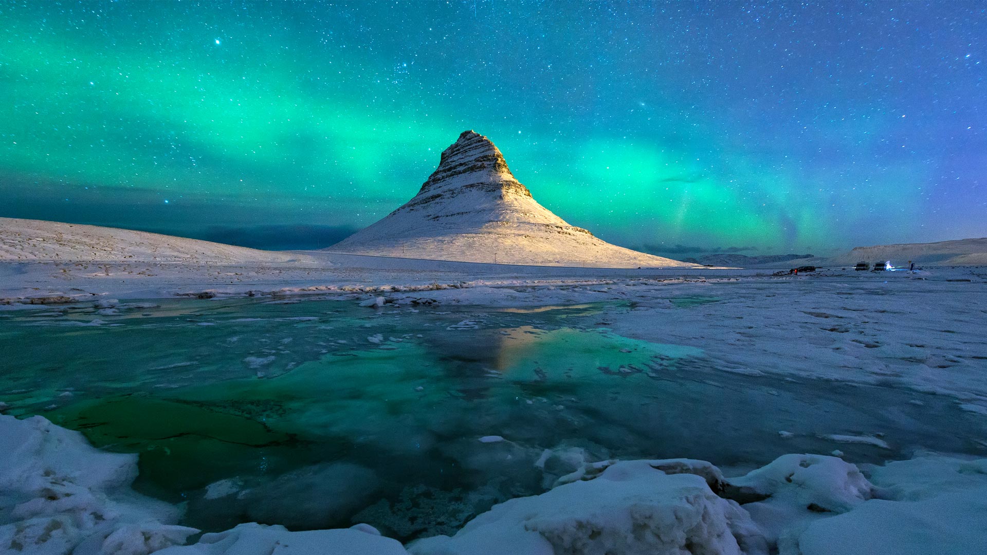A terra do gelo e do fogo Kirkjufell, península de Snæfellsnes, Islândia (© Ratnakorn Piyasirisorost/Getty Images)