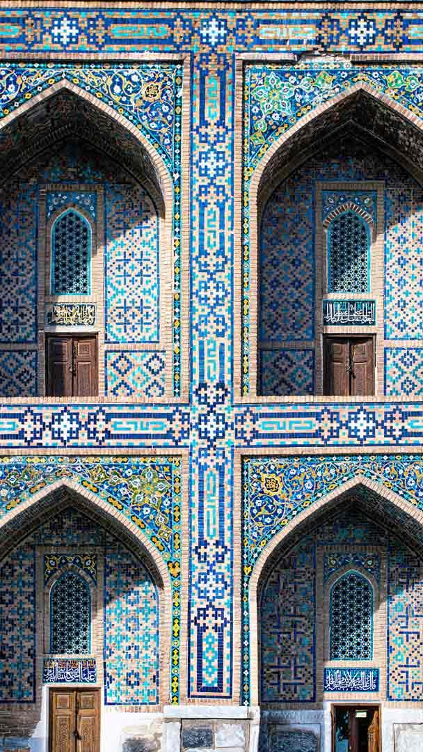 Contos de azulejos Fachada de mosaico na Praça Registan, Samarcanda, Uzbequistão (© da-kuk/Getty Images)