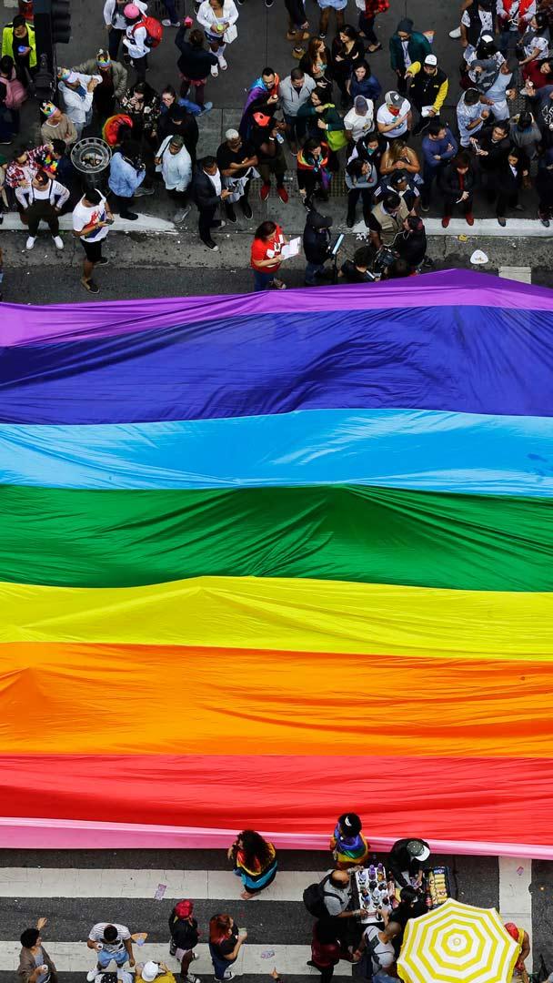 Dia de celebrar a diversidade Foliões enchem as ruas segurando uma bandeira gigante do arco-íris durante a parada anual do orgulho LGBT na avenida Paulista (© Nelson Antoine/Shutterstock)