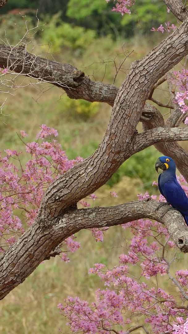 Bem-vinda, Primavera! Arara-azul em um ipê-rosa durante a estação de floração, Pantanal, Mato Grosso (© Luiz Claudio Marigo/Minden PIctures)