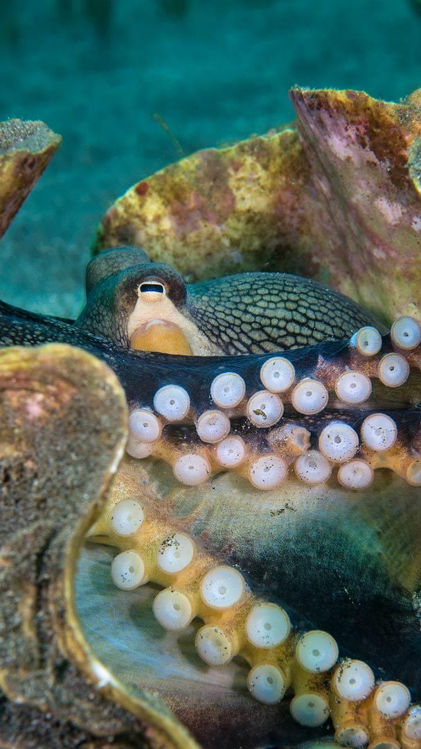 O que está se escondendo nesta concha gigante? Polvo veado em uma concha de tridacna, Mar de Sulawesi, Indonésia. (© Alex Mustard/Minden Pictures)