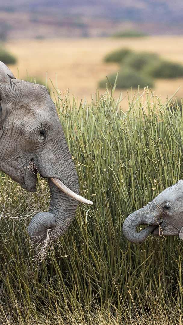 Um oásis de resistência Elefante do deserto e filhote se alimentando de capim alto, Namíbia (© Christophe Courteau/Minden Pictures)