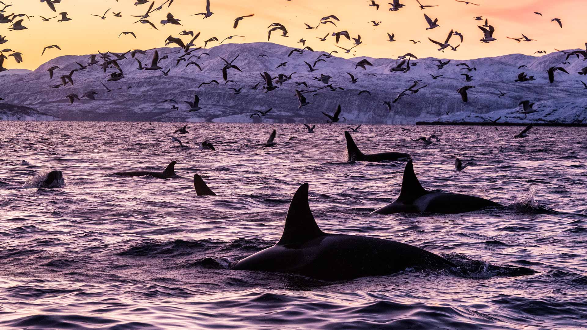 What are these predators doing? Killer whales in the waters off Spildra, Norway (© Alex Mustard/Minden Pictures)