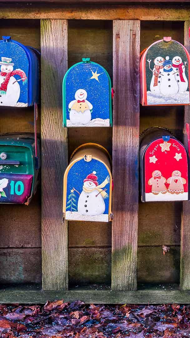 Floating mailboxes Winter themed hand painted mail boxes for Sea Village floating home residents, Granville Island, Vancouver (© Michael Wheatley/Alamy Stock Photo)