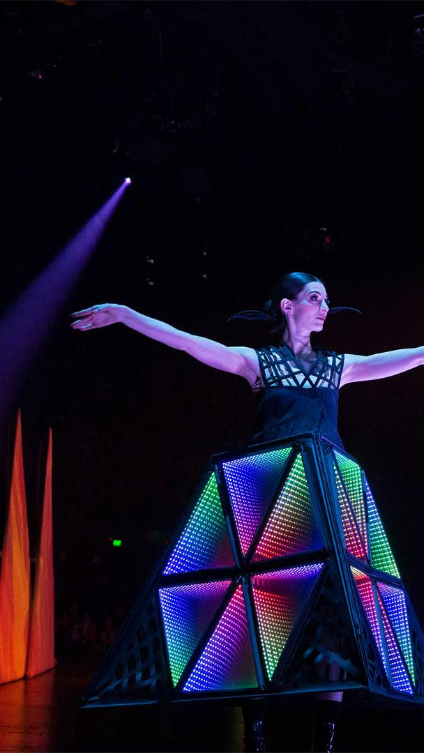 Blurring the lines with wearable art Infini-D, modelled during the World of WearableArt Awards in 2019 in Wellington, New Zealand (© Hagen Hopkins/Getty Images for World of WearableArt)