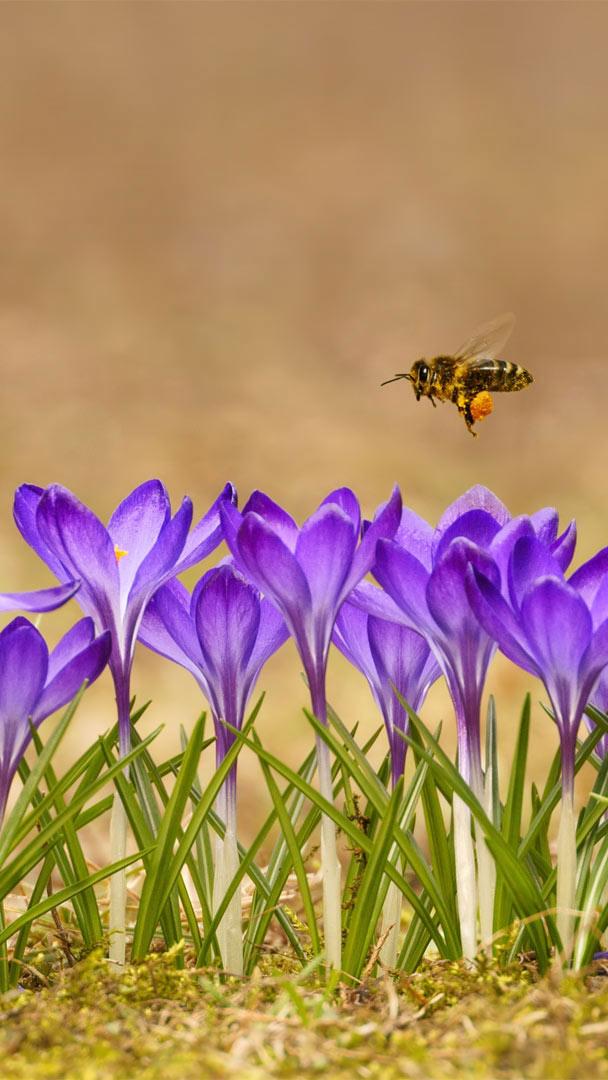 谢谢你们,小蜜蜂! Honeybee flying over crocuses in the Tatra Mountains, Poland (© Mirek Kijewski/Getty Images)