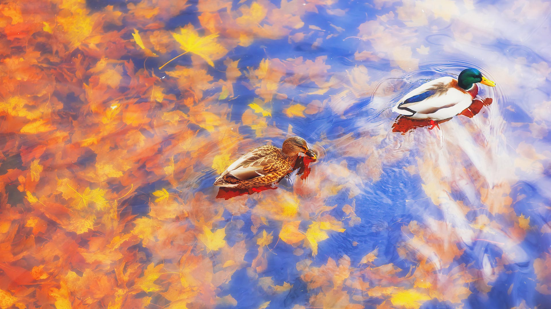 我所有的小鸭子们 秋天池塘里的两只绿头鸭 (© sun ok/Shutterstock)