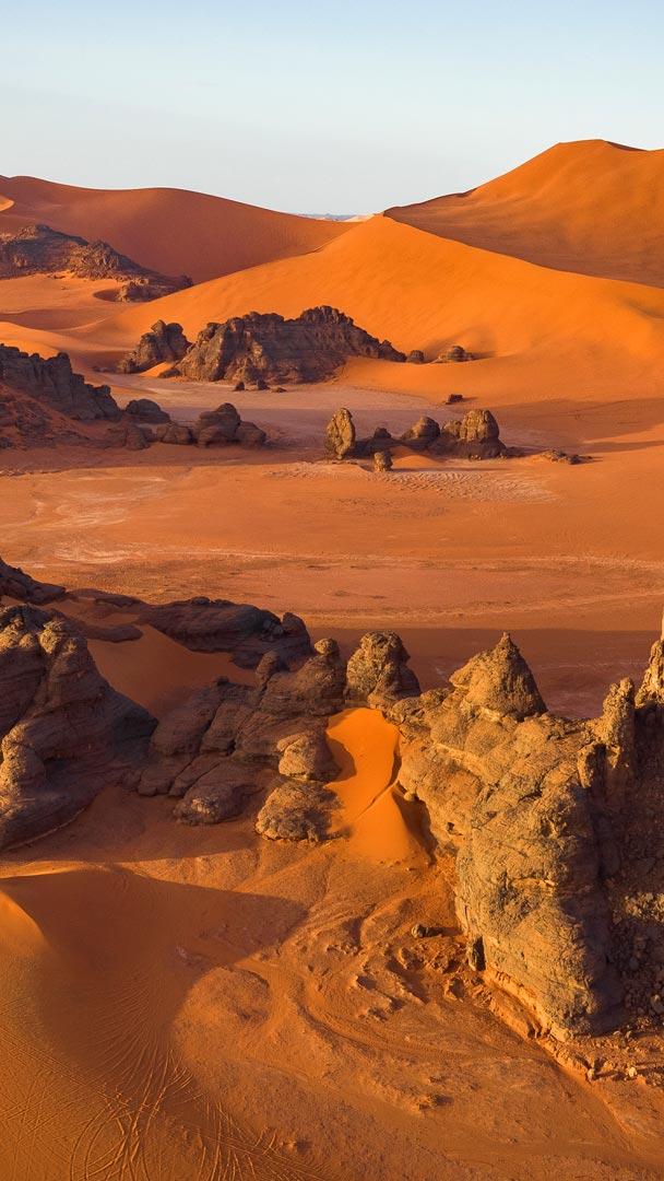 沙丘日和沙漠烟霞 撒哈拉沙漠的岩层和沙丘,贾奈特,阿尔及利亚 (© Airpano/Amazing Aerial Agency)