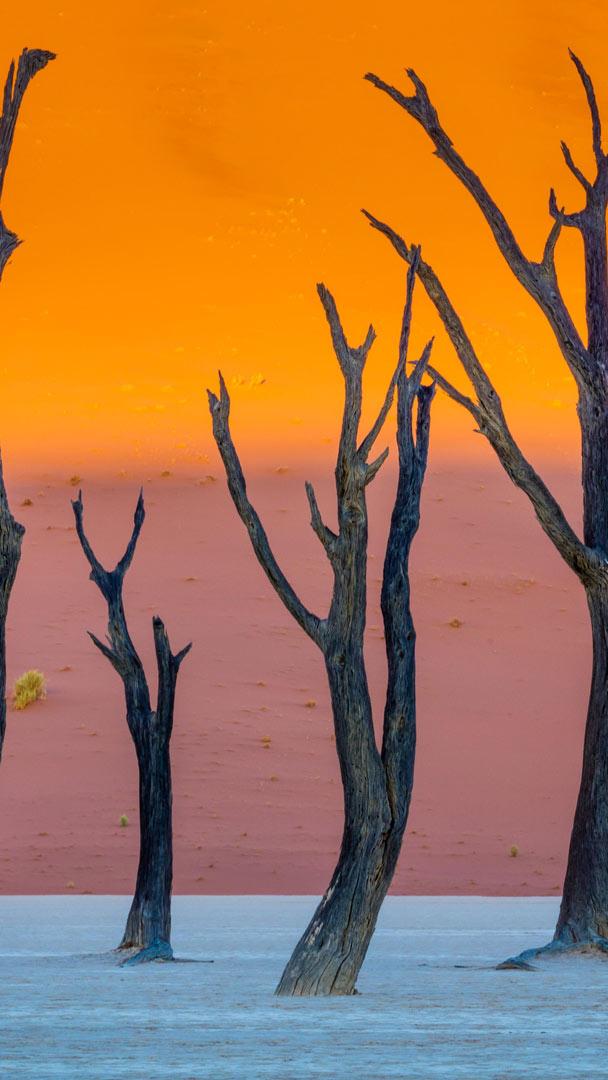 Mitten in der ältesten Wüste der Welt, der Namib, liegt eine der faszinierendsten Landschaften Afrikas: Deadvlei, auch bekannt als „weiße Tonpfanne“ im Namib-Naukluft-Nationalpark. Umgeben von bis zu 300 Meter hohen, rot leuchtenden Sanddünen, wirkt dieser Ort wie von einem anderen Planeten und zählt zu den bekanntesten Fotomotiven Namibias. Inmitten der höchsten Dünen der Welt ragen geheimnisvolle schwarze Silhouetten empor, die an eine surrealistische Kunstinstallation erinnern. Diese jahrhundertealten, abgestorbenen Kameldornbäume, wie auf unserem heutigen Bild zu sehen, sind längst zu zeitlosen Ikonen dieser alten Landschaft geworden und locken Fotografen aus aller Welt an. Seit über 900 Jahren trotzen sie der Verrottung – bewahrt durch die Trockenheit der Wüste und den salzhaltigen Boden. Als stille Zeugen vergangener Jahrhunderte tragen sie eine besondere kulturelle Bedeutung in sich. Die Region ist ein beeindruckendes Reiseziel für Abenteurer, Wanderer und Naturfreunde.