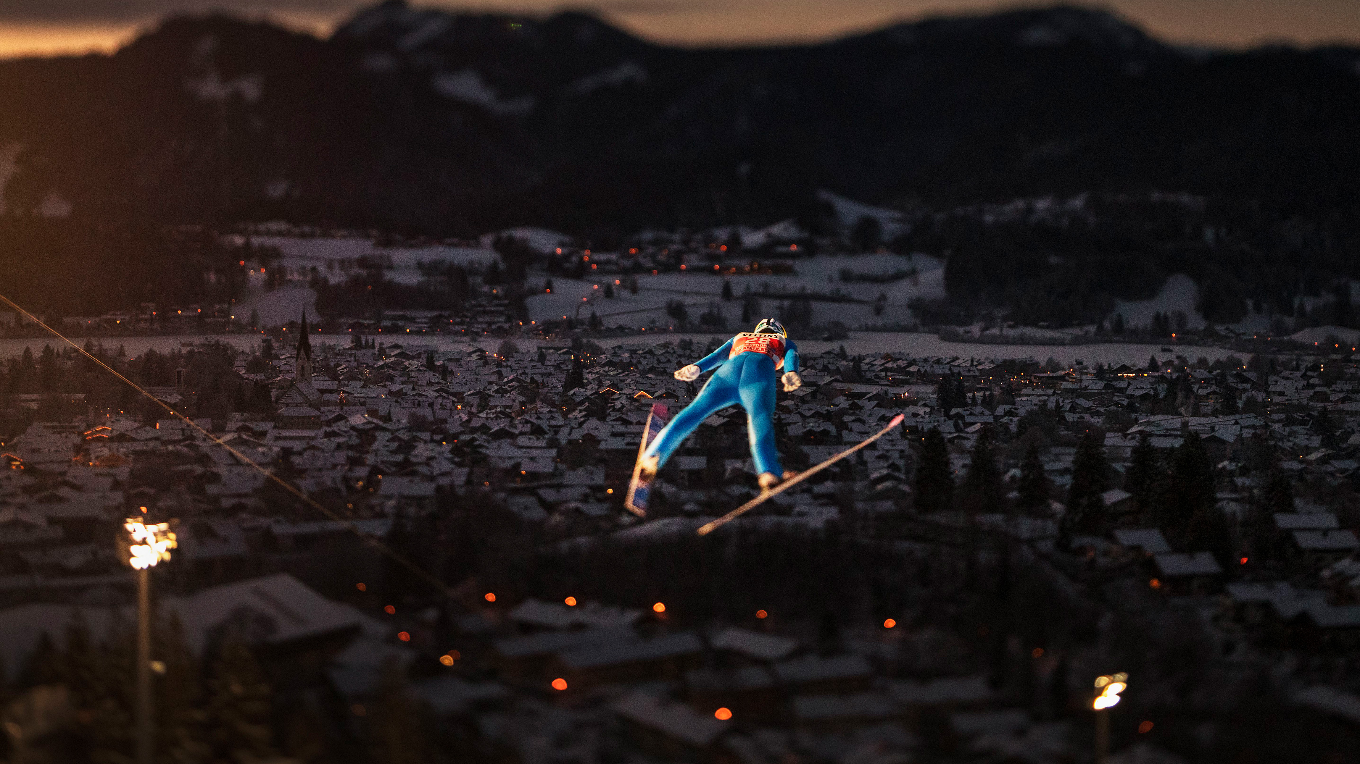 Völlig losgelöst Der finnische Skispringer Antti Aalto während seines Sprungs bei der Vierschanzentournee in Oberstdorf am 29. Dezember 2020, Bayern (© Adam Pretty/Getty Images)