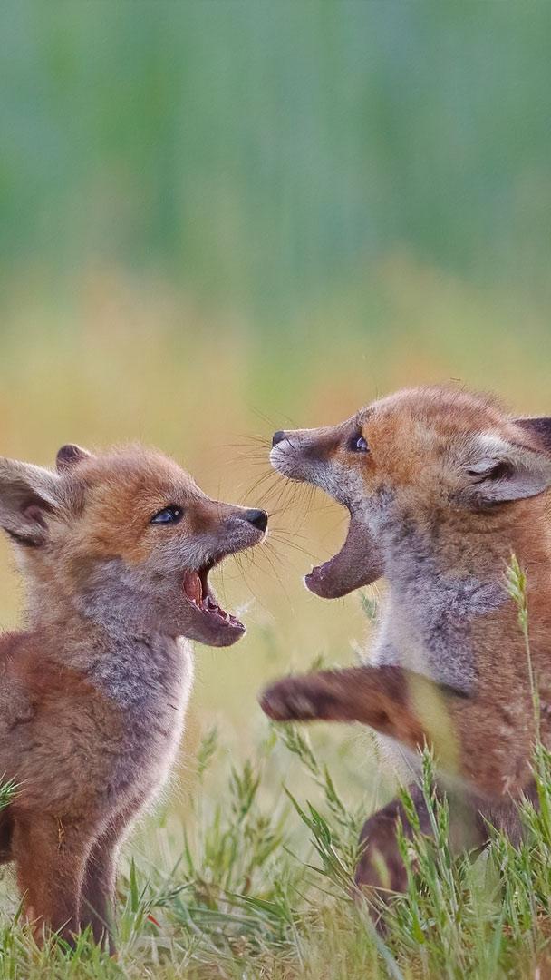 Lebenskraft durch Freundschaft und Leidenschaft Zwei Jungfüchse spielen auf einer Wiese, Deutschland (© Reibertb/Getty Images)
