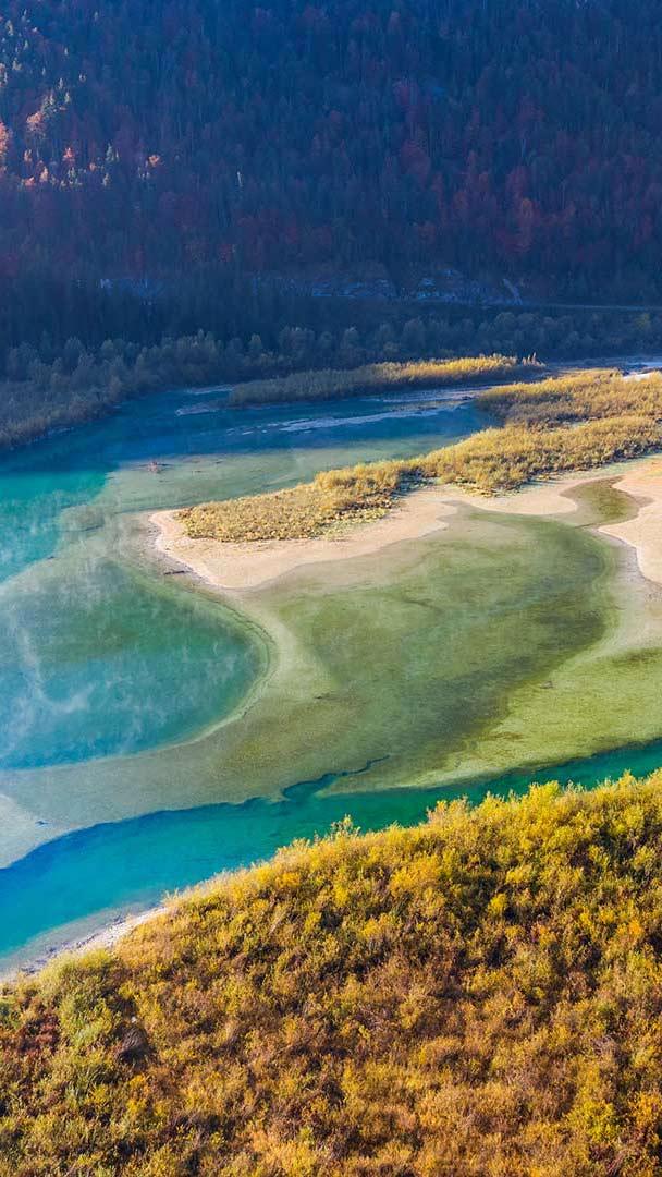 Glasklares Wasser mündet in einen Stausee Luftaufnahme der Isar an der Einmündung in den Sylvensteinspeicher, Isarwinkel, Lenggries, Bayern (© Martin Siepmann/Shutterstock)