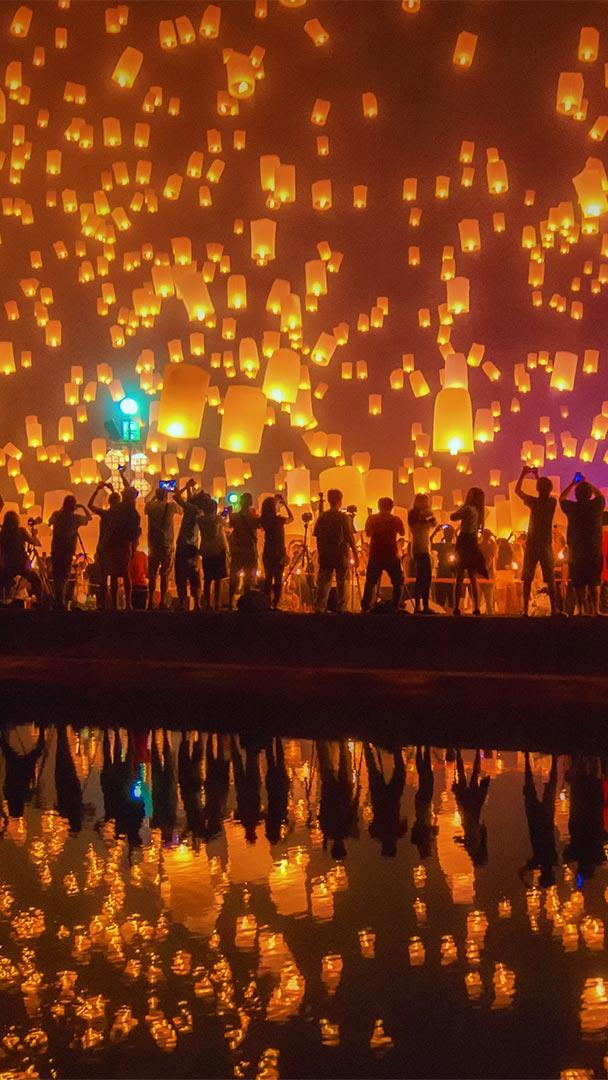 Hoffnungen und Gebete steigen in den Himmel Abhebende Himmelslaternen während des Yi-Peng-Festivals in Chiang Mai, Thailand (© Suttipong Sutiratanachai/Getty Images)