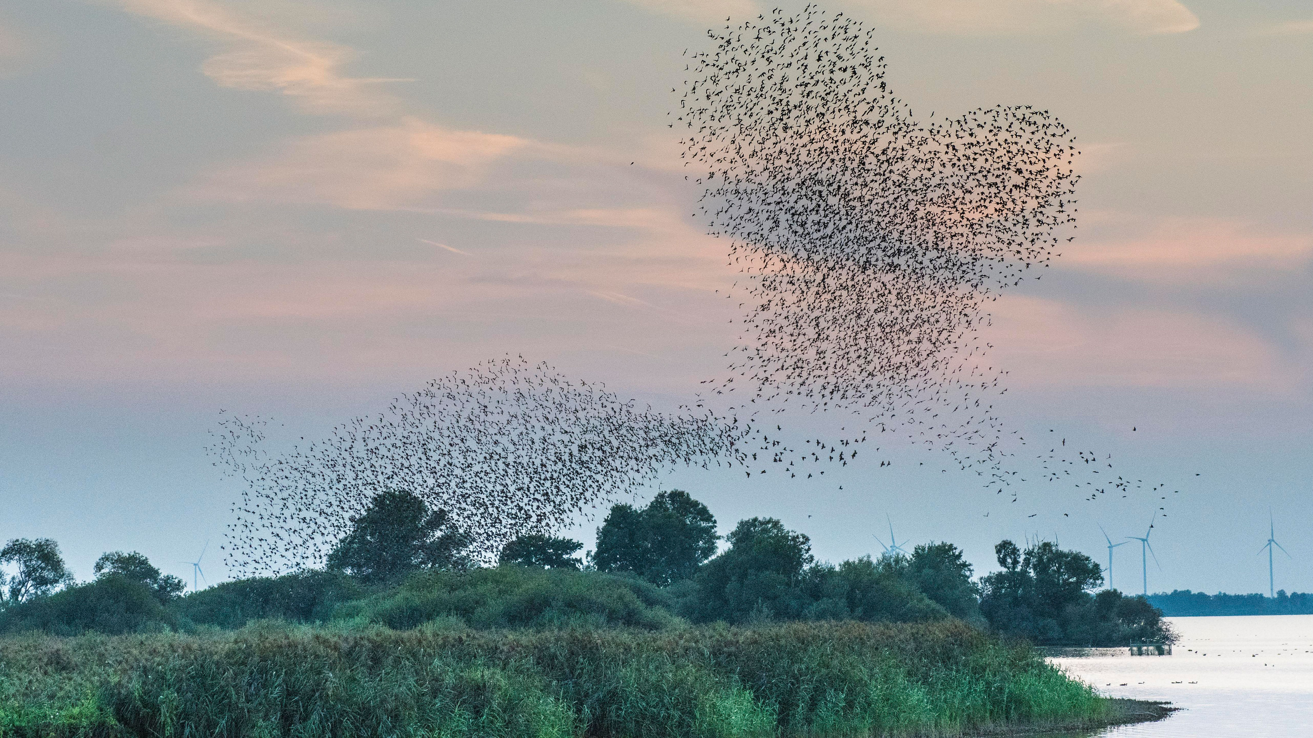 Faszinierender Formationsflug Herzförmiger Starenschwarm bei Lembruch, Naturpark Dümmer, Niedersachsen (© Christian Kosanetzky/Getty Images)