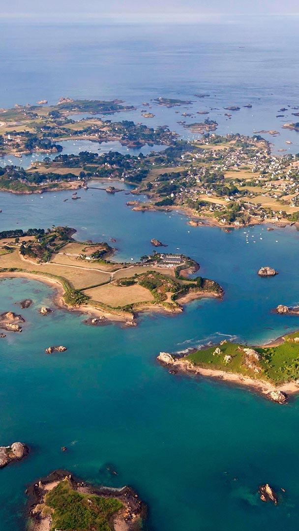 „Insel der Blumen und der rosa Felsen“ Luftaufnahme der Bréhat-Inseln im Ärmelkanal, Bretagne, Frankreich (© LECLERCQ Olivier/hemis.fr/Alamy)