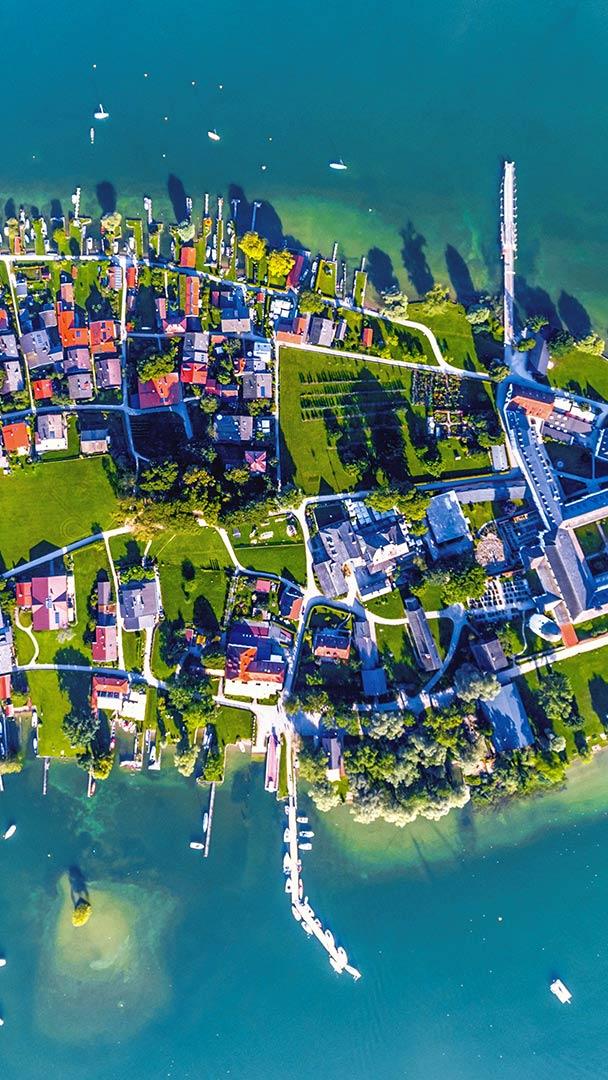 Inselflair im „Bayerischen Meer“ Luftbild der Fraueninsel im Chiemsee, Bayern (© Malorny/Getty Images)