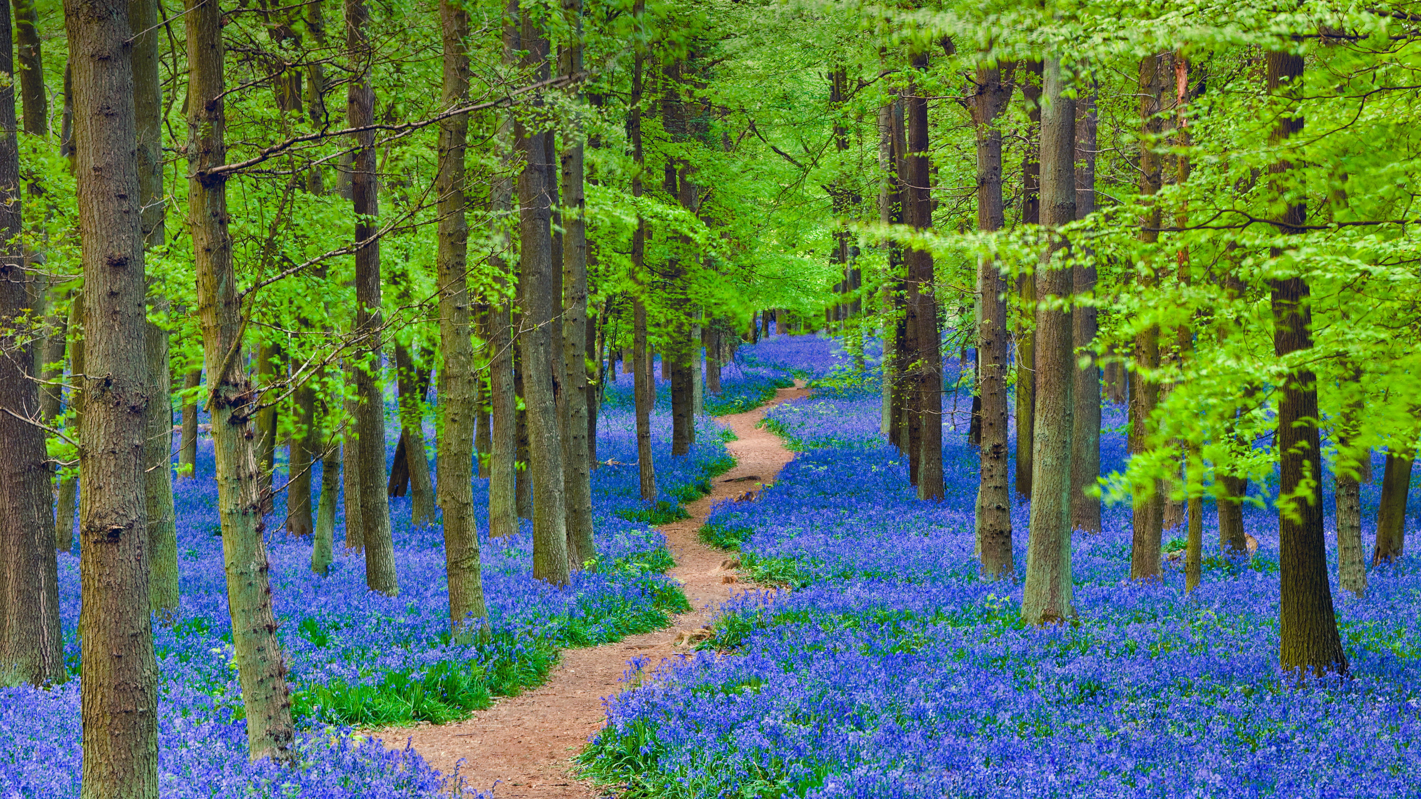 Pfad durch ein Blütenmeer Atlantische Hasenglöckchen in einem Wald in Hertfordshire, England, Vereinigtes Königreich (© JayKay57/Getty Images)