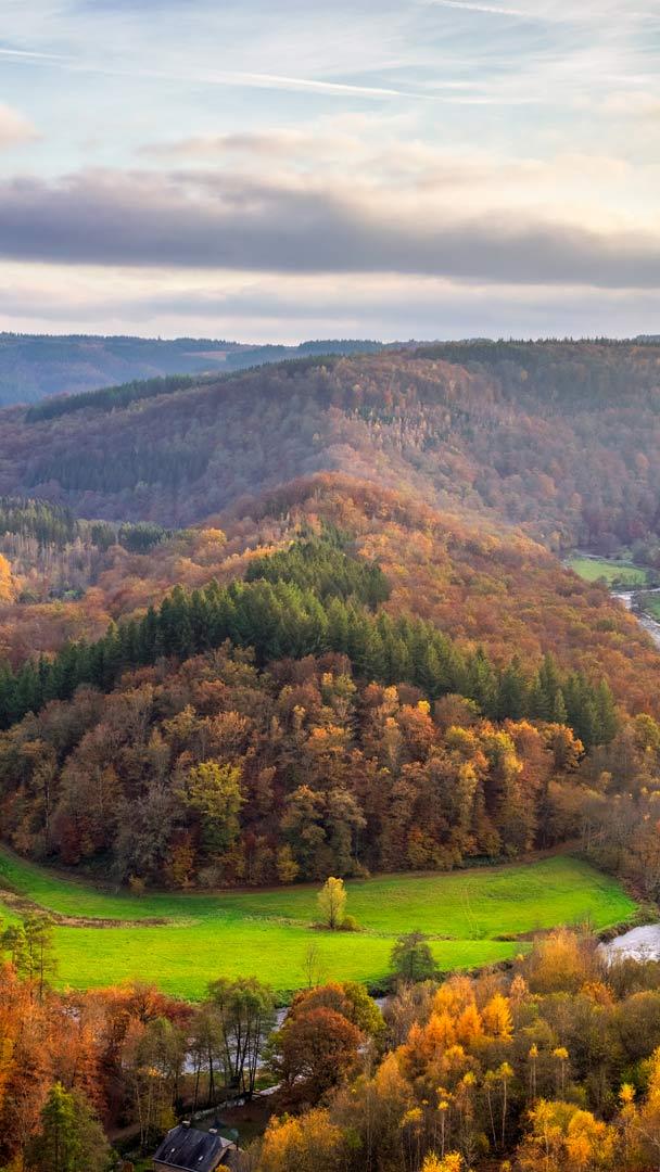 El Tombeau du Géant, en Bouillon, Bélgica, no es el típico mirador con vistas impresionantes. Conocido como la Tumba del Gigante en español, parece un gigante durmiendo en una curva del río Semois, que se extiende más de 200 kilómetros. Su nombre proviene de una leyenda sobre un gigante llamado Treviso, quien, según la historia, prefirió saltar de los acantilados de Rocher des Gattes antes que ser capturado por los romanos. Este mirador es muy popular entre senderistas y viajeros, y el paisaje que ofrece cambia con cada estación. En otoño, los tonos cálidos lo hacen un lugar perfecto para los amantes de la naturaleza y la fotografía, como puedes ver en la imagen de hoy.