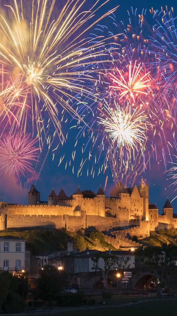 Allons enfants ! Feu dartifice du 14 juillet à Carcassonne, Occitanie (© Buena Vista Images/Getty Images)