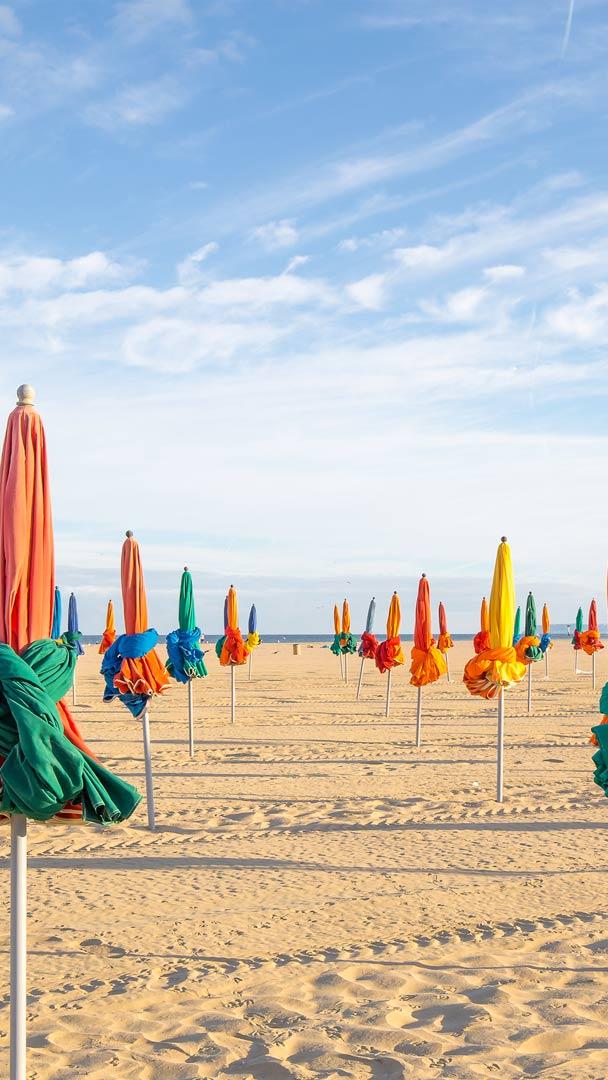 Vive les vacances d’été ! Les célèbres parasols multicolores de la plage de Deauville, Normandie (© Kiszon Pascal/Getty Images)