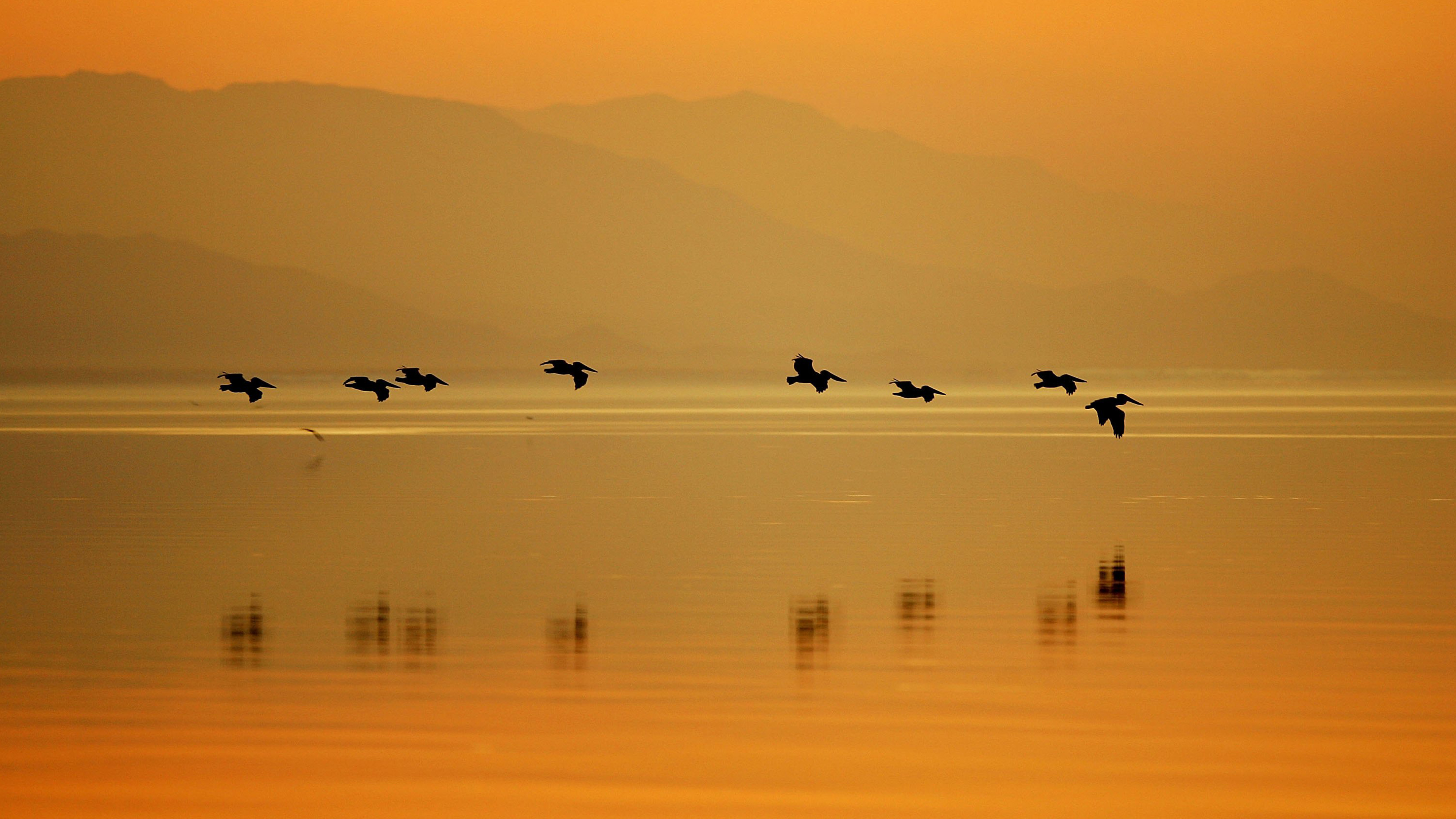 Where are these birds headed? Pelicans at Sonny Bono Salton Sea National Wildlife Refuge, California (© David McNew/Getty Images)