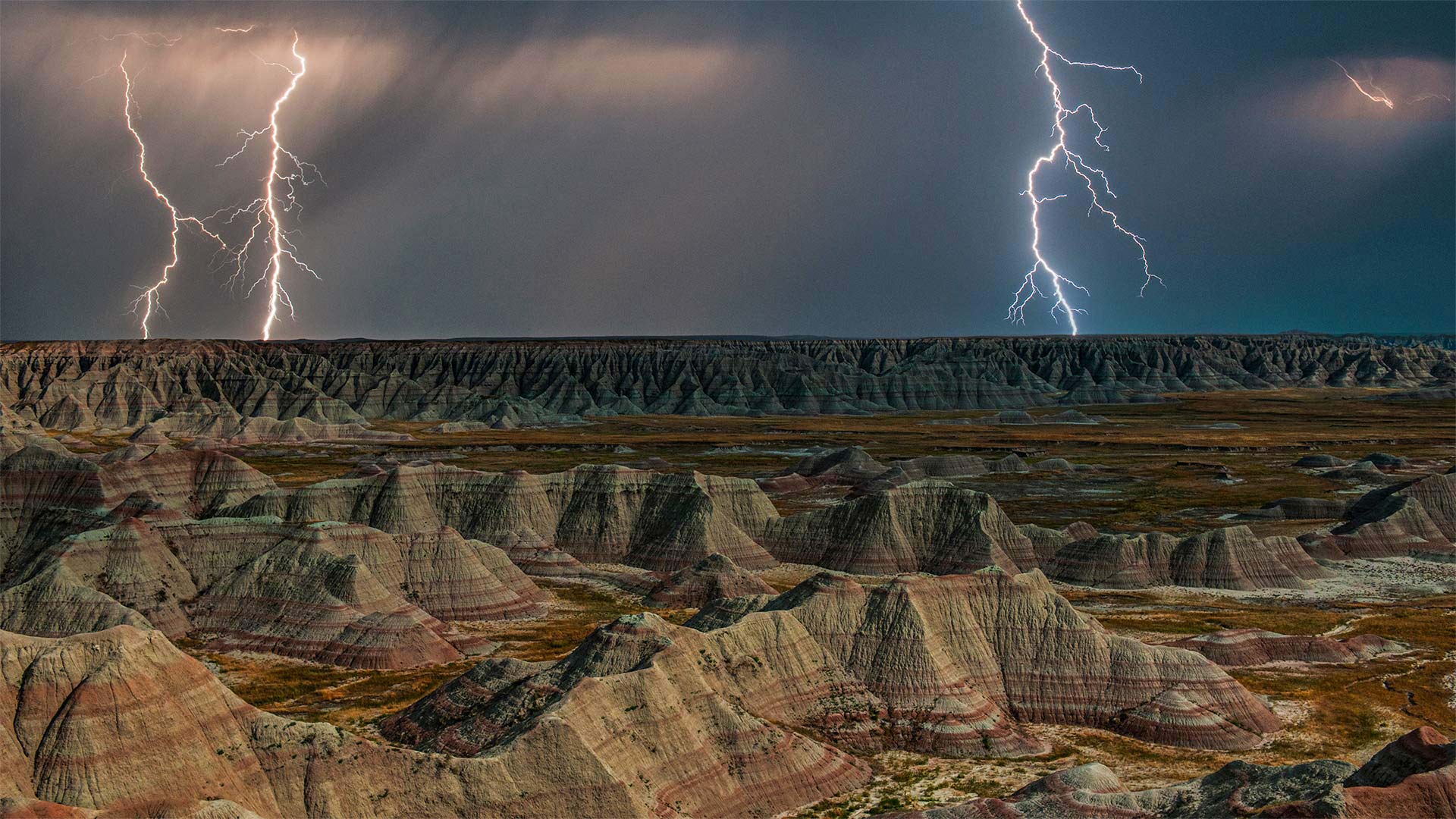 Happy birthday Badlands National Park Rock formations in Badlands National Park during a lightning storm, South Dakota (© DEEPOL by plainpicture)