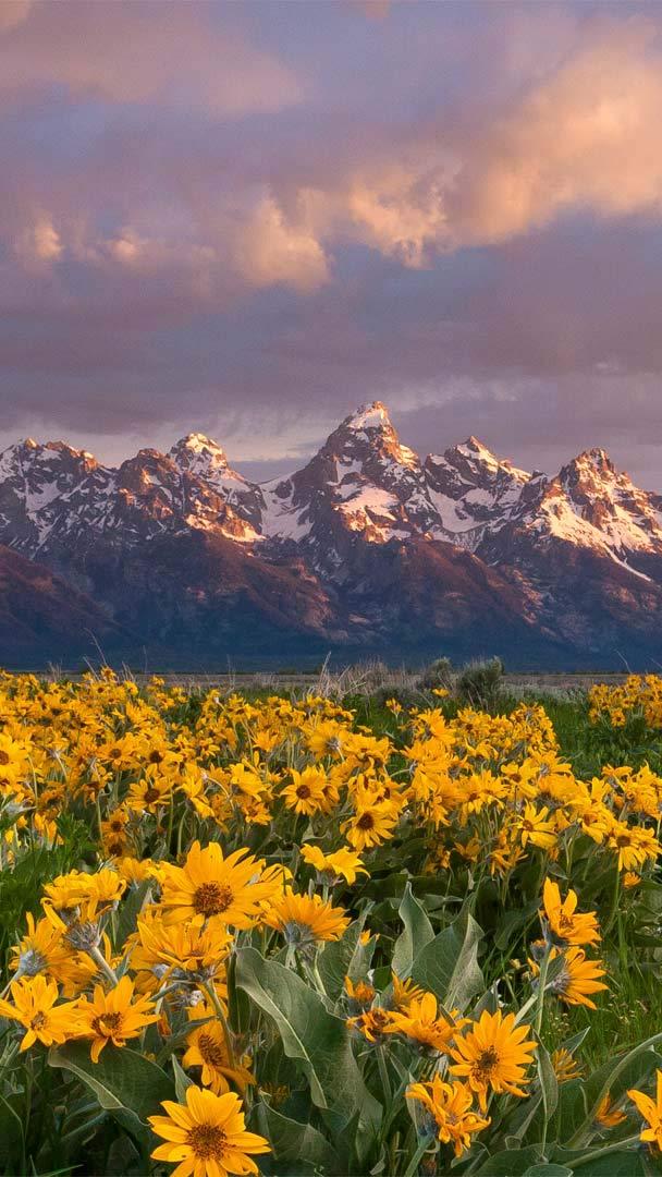 A grand view Balsamroot wildflowers bloom below the Teton Mountains in Grand Teton National Park, Wyoming (© Mike Cavaroc/Tandem Stills + Motion)