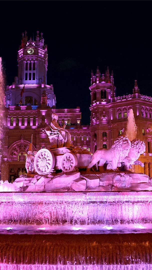 Celebriamo le donne ogni giorno! La fontana di Cibeles e il municipio di Madrid illuminati per la Giornata internazionale della donna, Madrid (© dpa picture alliance/Alamy)