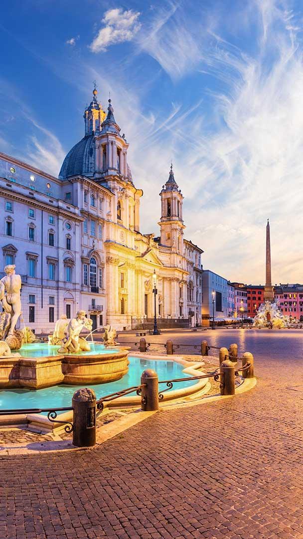 L’Epifania tutte le feste porta via Piazza Navona with the Moor Fountain and Basilica at sunset, Rome, Italy (© Anton Aleksenko/agefotostock/Alamy Stock Photo)