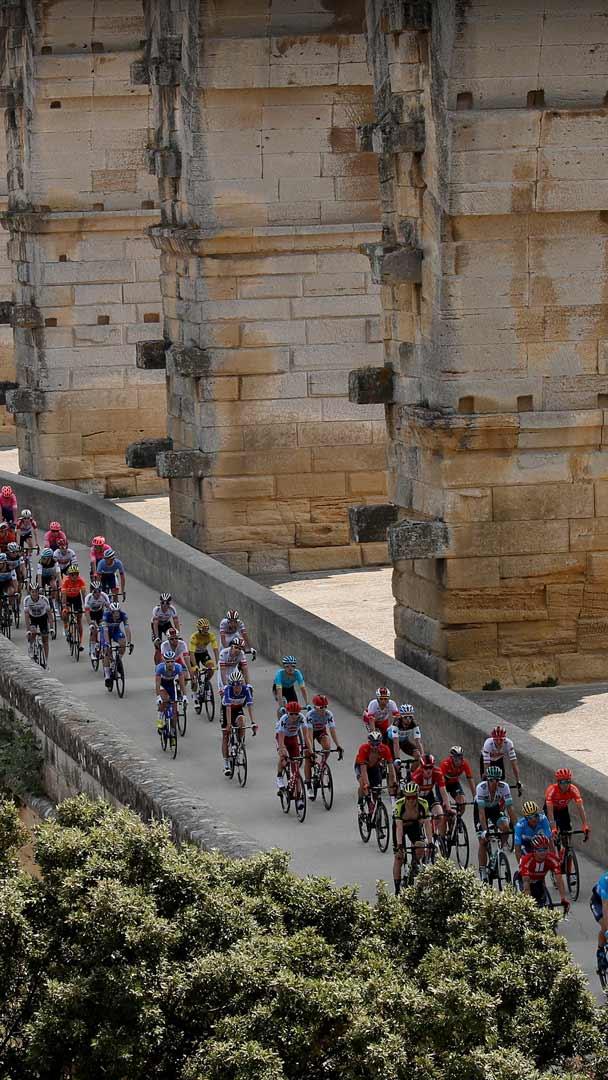 Pronti per il Grand Départ? Ciclisti del Tour de France attraversano il Pont du Gard, Francia (© Gonzalo Fuentes/Reuters)