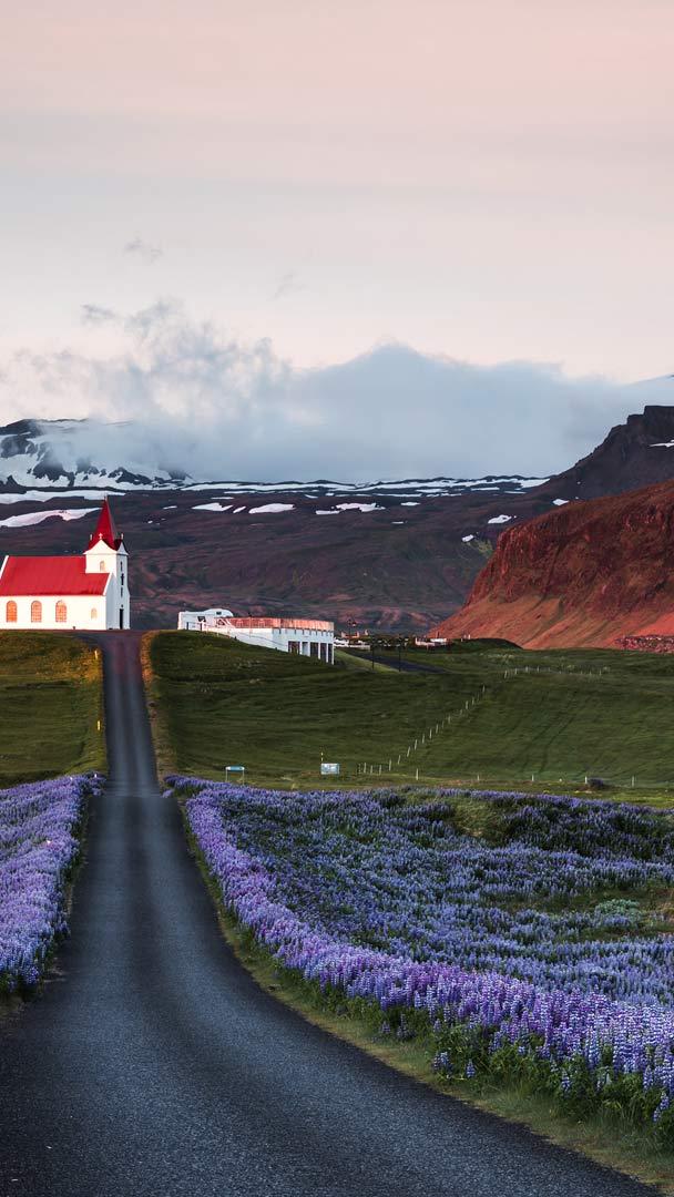 Strade scandinave Campi di lupini e una chiesa allalba, penisola di Snæfellsnes, Islanda (© Matteo Colombo/Getty Images)
