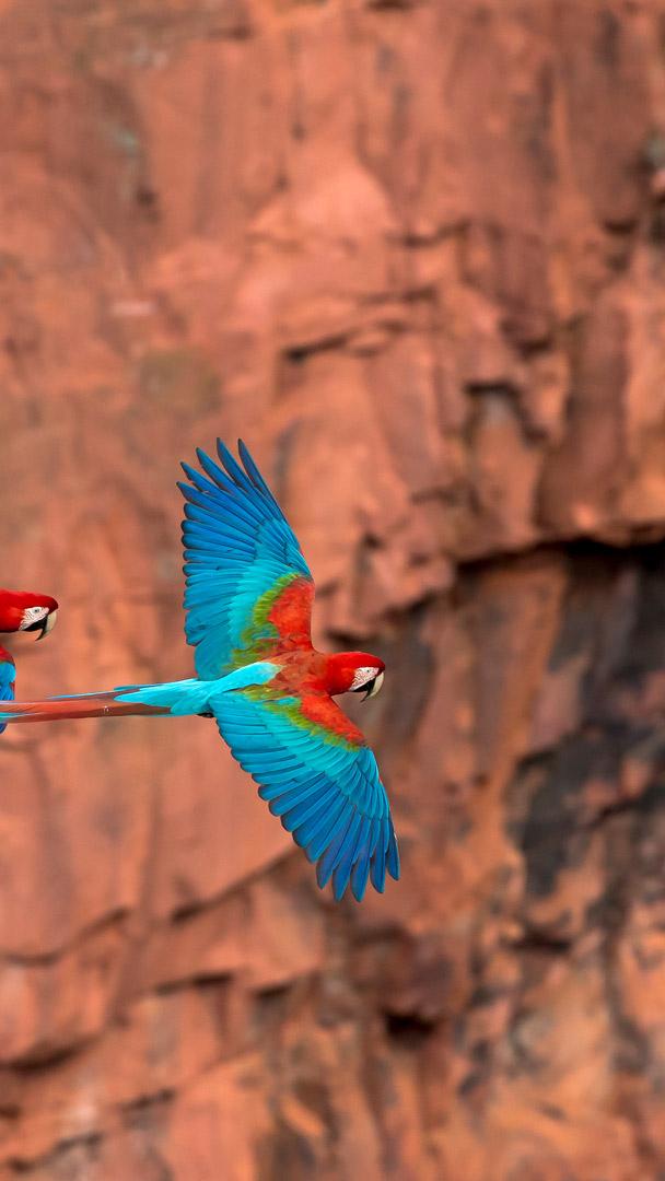 今日の画像はブラジルのマットグロッソ・ド・スル州で撮影されたベニコンゴウインコ。南米北部の森林に広く分布しているオウム目ヨウム科の一種で、鮮やかな赤色の羽毛を持ち、翼の下部には緑色の羽毛があります…