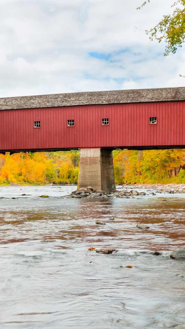 鮮やかな赤い屋根付き橋 © pabradyphoto/Getty Images