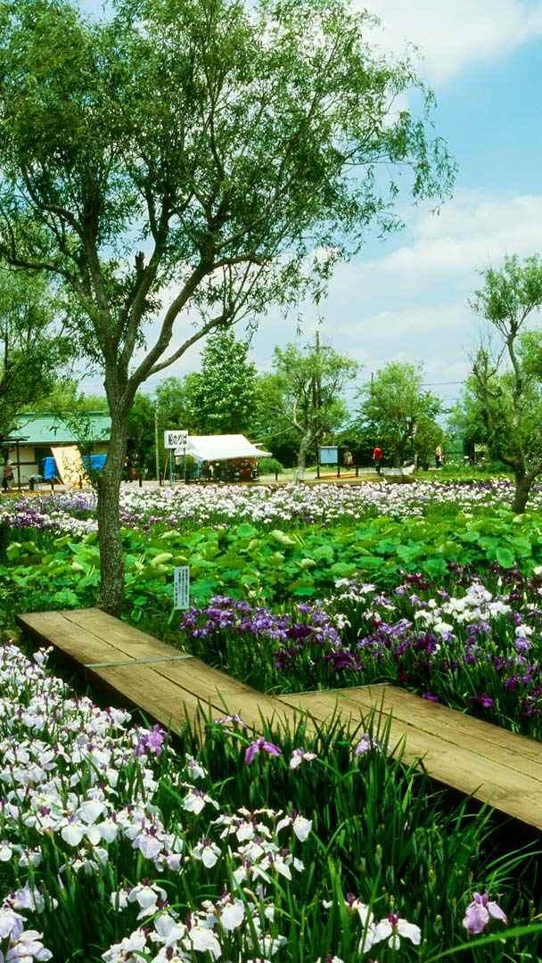 水郷筑波国定公園内に位置する水郷佐原あやめパークは、島や橋、水路が配され、江戸時代から続く水郷の風情を今に伝えています。6 月上旬には 400 品種 150 万本のハナショウブ、7 ~ 8 月には約 300 品種のハスが咲き誇り、園内水路を巡るサッパ舟という小舟に乗って、その様子を間近で楽しむことができます…