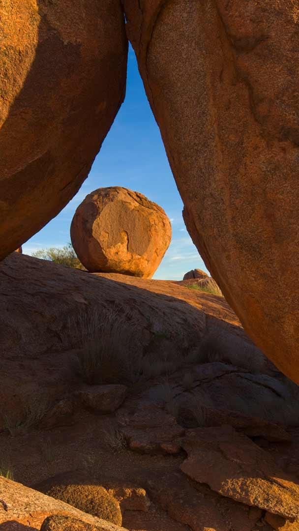 ここはオーストラリアのデビルズマーブルズ保護区で、巨大な丸い岩が散らばる風景で知られています。また、先住民のアボリジニにとっては「カルル・カルル」と呼ばれる神聖な場所であり、彼らの伝説や儀式に深く関わっています…
