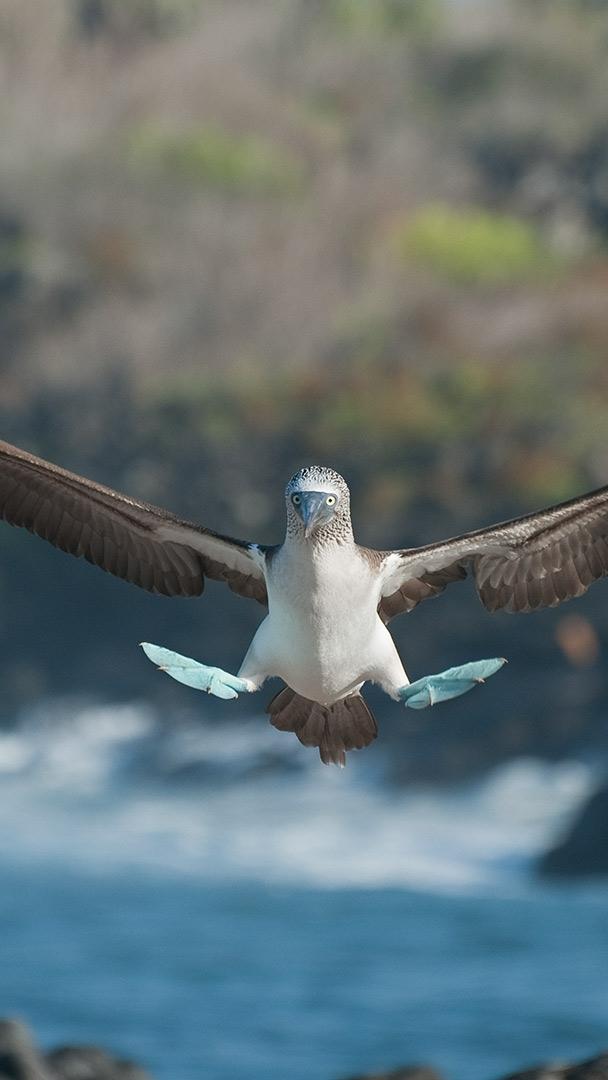 A smooth landing, feet first Blue-footed booby, Galápagos Islands, Ecuador (© Tui De Roy/Minden Pictures)