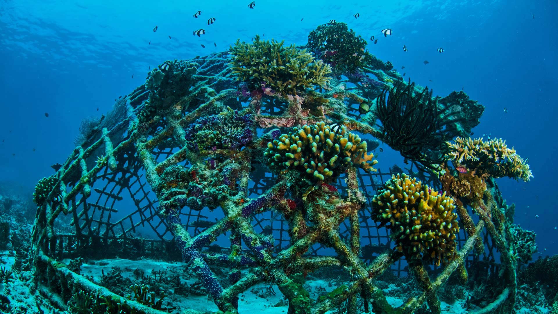 Humans have been trying to construct artificial coral reefs since at least the 1950s, with only marginal success. But in 1979, German scientist and inventor Wolf Hilbertz created ‘Biorock,’ also known as ‘Seacrete.’ Hilbertz found that by directing a low-voltage charge to a metal frame submerged in seawater, calcium and other minerals in the water would build up on the frame. This mineral coating is so similar to the mineral composition of natural reef substrate that it creates a good habitat for the growth of corals. After the minerals have begun to coat the surface, divers transplant coral fragments from other reefs, attaching them to the structure’s frame. These coral pieces begin to bond to the accreted mineral substrate and start to grow, typically faster than in natural environments. Eventually the reef looks and functions like a natural reef ecosystem rather than an artificial one.
