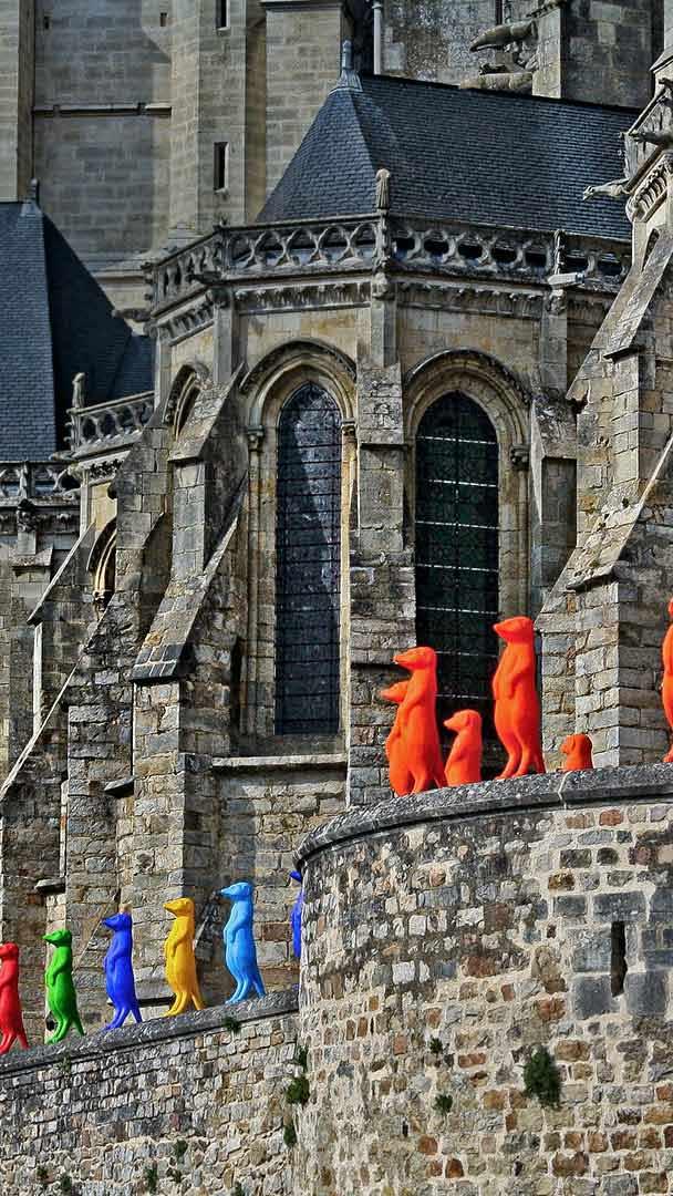 If you ever encounter a giant plastic snail in the city or an army of rainbow-colored meerkats holding sentry outside a historic building, it’s likely an art installation from the Cracking Art collective. The group uses recyclable plastic to craft vivid representations of meerkats, elephants, snails, and other natural creatures for traveling art installations in unexpected locations. The collective’s use of plastic is meant to call attention to the sometimes blurry connection between natural and artificial reality, inviting viewers to reexamine the world around them. The meerkat exhibit on our homepage took place in 2015 at Le Mans Cathedral in Le Mans, France.