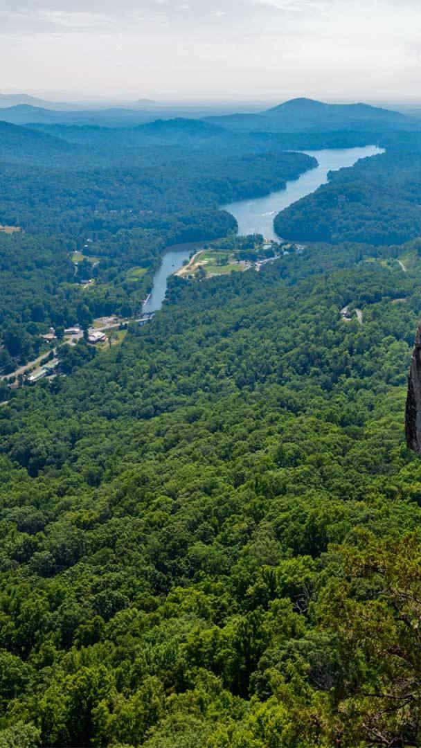 We"re at Chimney Rock State Park, about 25 miles southeast of Asheville, North Carolina, for Flag Day. The 6,807-acre park gets its name from the 315-foot spire that offers expansive views of Hickory Nut Gorge and Lake Lure with the Blue Ridge Mountains in the distance. If you"re wondering how this sizable flag made it up to the summit, we don"t know the answer to that. But there is an elevator inside the mountain that can zip you to the top in 32 seconds. The other option is to hike up the 499 steps to the viewpoint.
