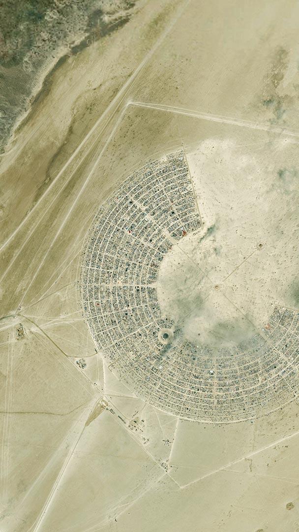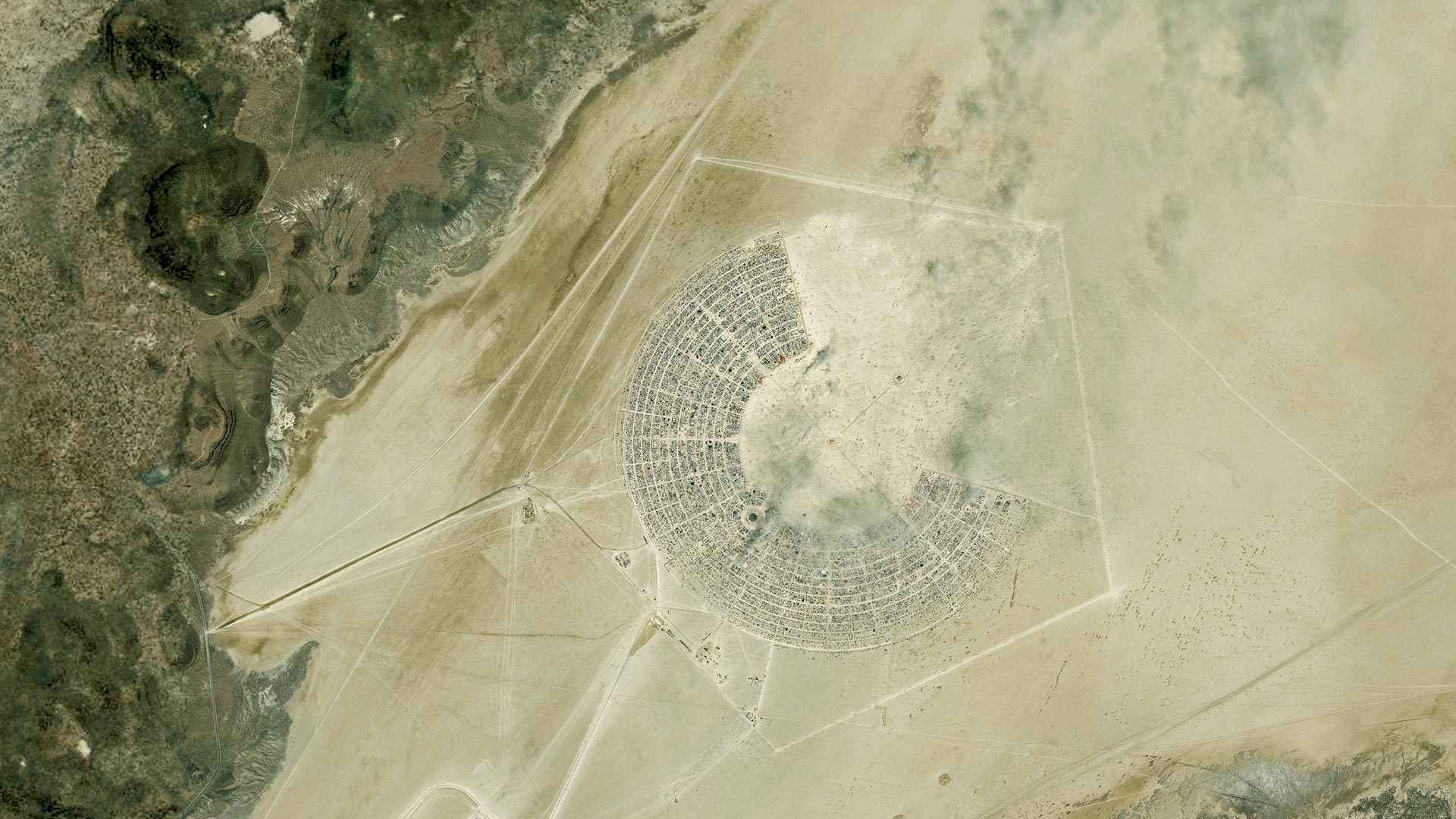 Today we’re viewing North America’s largest arts and music festival—dust free—from a satellite lens. Welcome to Black Rock City, the pop-up home of Burning Man, a raucous event that takes place in late summer each year on the sun-scorched alkali flats of Nevada’s Black Rock Desert. It’s an unusual set-up, a counterculture mecca where gifts reign supreme and money has no value.