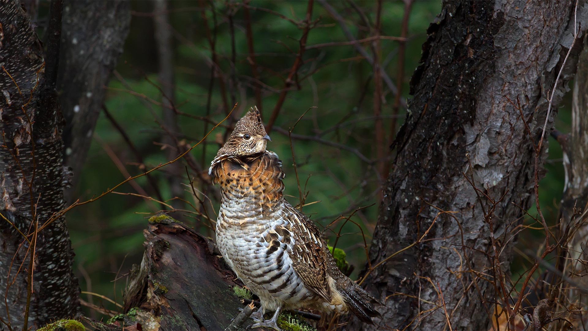Native to forests rich in aspens and poplars across Canada and the US, ruffed grouse are nonmigratory birds who spend their entire lives in the same area. This one"s posing for us in the forest of Algonquin Provincial Park in Ontario, Canada. Depending on the habitat they"re in, their feathers can range in color from gray to red as a means of camouflage to protect themselves from predators. They get their name from the ruff of dark feathers on their neck. Despite being primarily ground-dwelling birds, ruffed grouse can be quite the acrobatic fliers when needed. They excel at flying in short spurts and are skilled at making sharp twists and turns when navigating through thick deciduous forests. How"s that for beauty and brawn?