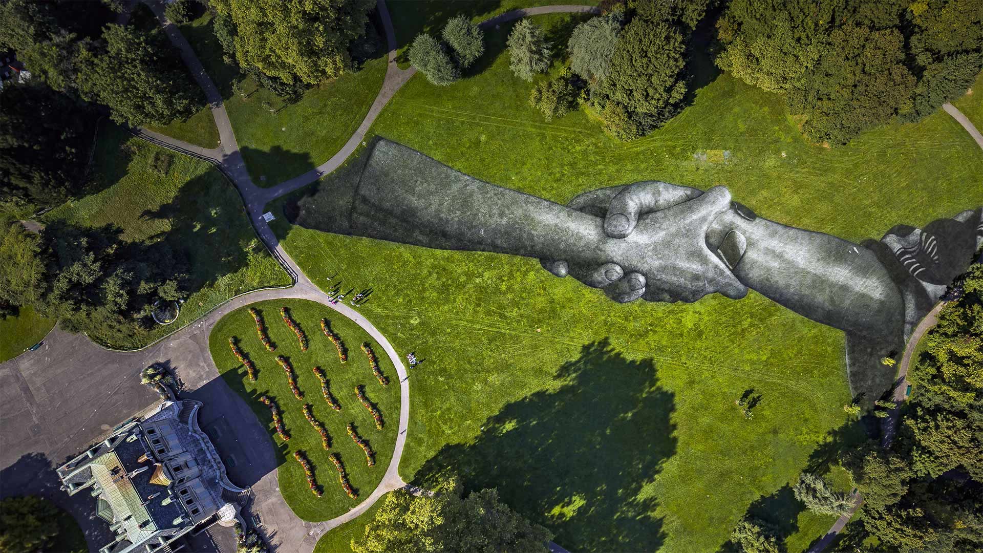 For World Refugee Day, we"re featuring an aerial view of "Beyond Walls," an art installation by the French artist Saype. In the span of five years, he aims to create the longest symbolic human chain around the world by constructing outdoor designs of interlaced hands just like this in over 20 cities. The first four were completed in 2019 in Paris, Andorra, Berlin and Geneva, Switzerland, shown here.