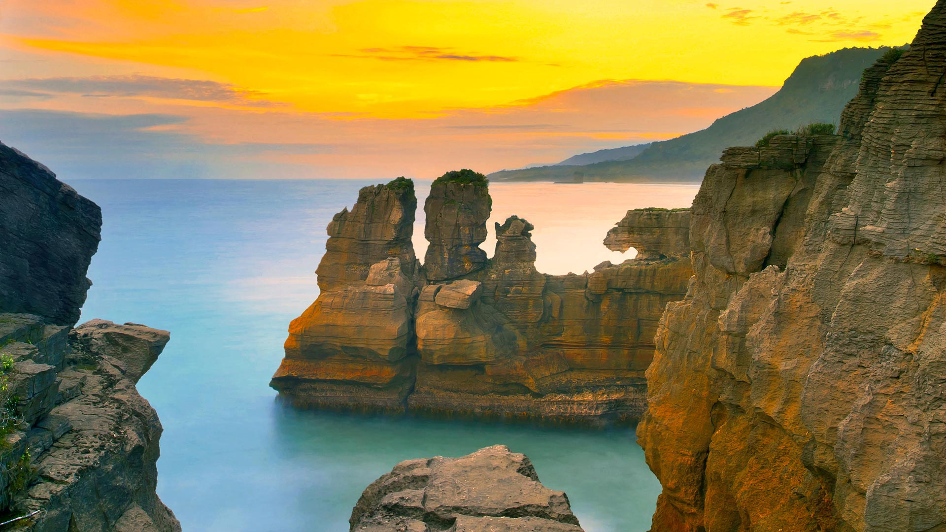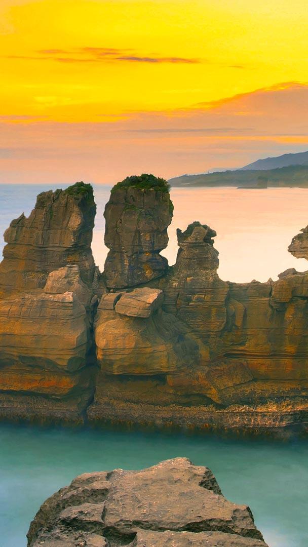 This portion of New Zealand"s South Island coast features plenty of strange geology. The Pancake Rocks, so named due to the stacked, flat layers of sediment and stone, were once underwater. As the Tasman Sea receded, the unusual rocks became the Punakaiki region"s shore. Erosion created openings along the cliffs called "blowholes." When the tide comes crashing in, water sprays up through the openings, and if you"re standing too close, you"ll get soaked.