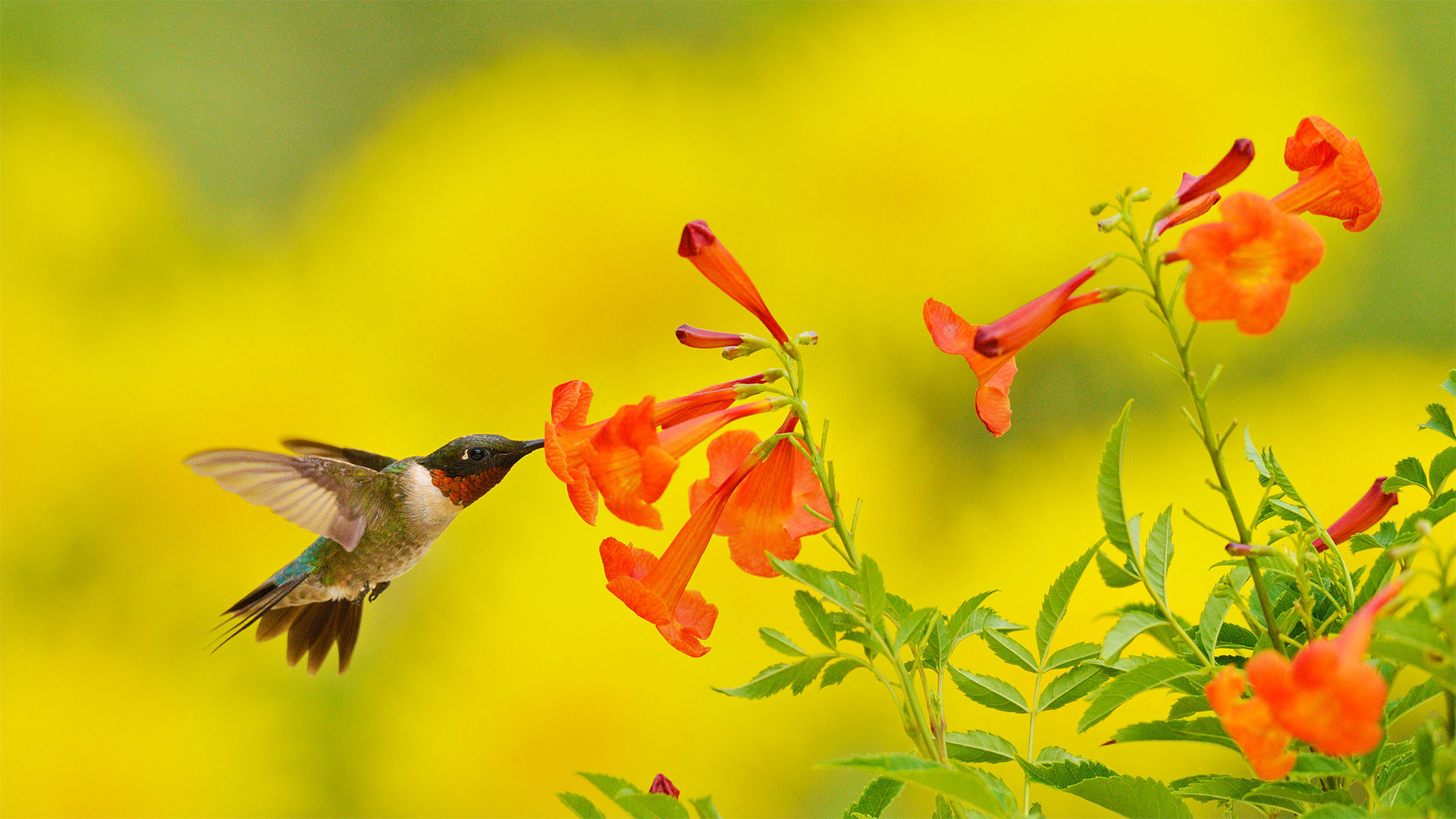 The ruby-throated hummingbird in today"s homepage image is snacking on some yellow bells in the Texas Hill Country, preparing for its long journey south for the winter. This time of year, the hummingbirds leave the northern latitudes of the eastern US and Canada, migrating to the warmer climes of Mexico and Central America. Along their route, many will cross the Gulf of Mexico in a single 500-mile flight, which can take 18-22 hours of nonstop flying at speeds of up to 35 miles per hour. Tiny but fierce, the ruby-throated hummingbird weighs less than a nickel. It beats its wings about 53 times a second on average, but during courtship the wingbeat rate increases to 200 times per second, the fastest of any bird.