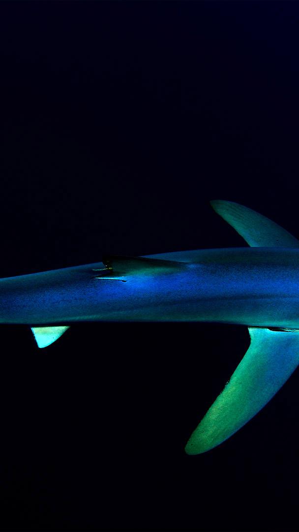 This blue shark is swimming near the Azores, a Portuguese chain of islands about 850 miles west of mainland Portugal. The inspiration for the shark"s name comes from its back color, which can vary from a light blue to a darker shade. Its slender, tapered body is propelled through the water with agility and grace by a long tail fin that sweeps from side to side. Listed as "near threatened," blue sharks are found off the coast of every continent except for Antarctica, making them the most widely distributed of all sharks. Swift and powerful swimmers, blue sharks migrate long distances. It"s common for them to swim 1,200 to 1,700 miles or even farther, following the clockwise currents of the Gulf Stream in search of food, mates, and "just right" water temperatures.