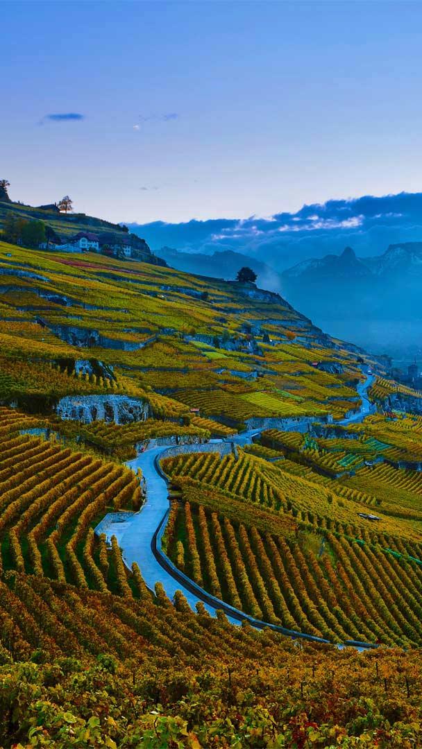 The "crush season," aka the grape harvest, has arrived in these picturesque Swiss vineyards. The steeply terraced vineyards of the Lavaux region along Lake Geneva"s northern shore produce grapes for some of the best wine in the country. The vine terraces can be traced back to the 11th century, when Benedictine and Cistercian monasteries controlled the area. A UNESCO World Heritage site since 2007, Lavaux is the largest contiguous vineyard region in Switzerland. It"s known for producing Chasselas wine, a light, delicate white wine that"s considered the ideal pairing with Swiss raclette cheese. Visitors enjoy hiking between the vines and wine tasting at local cellars in the villages along the lakeshore. We"ll toast to that!