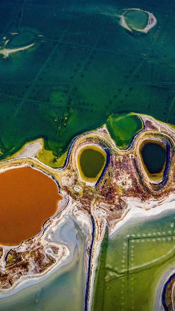 Xiechi Lake in Yuncheng, China, has such a high level of salinity, it"s sometimes called China"s Dead Sea. But unlike the Dead Sea in the Middle East, Xiechi Lake supports abundant microscopic life: algae and other microorganisms that have a high tolerance for the salt. In summer and autumn, the lake temperature is high enough to spark algae blooms, bringing a variety of intense colors to the lake water.